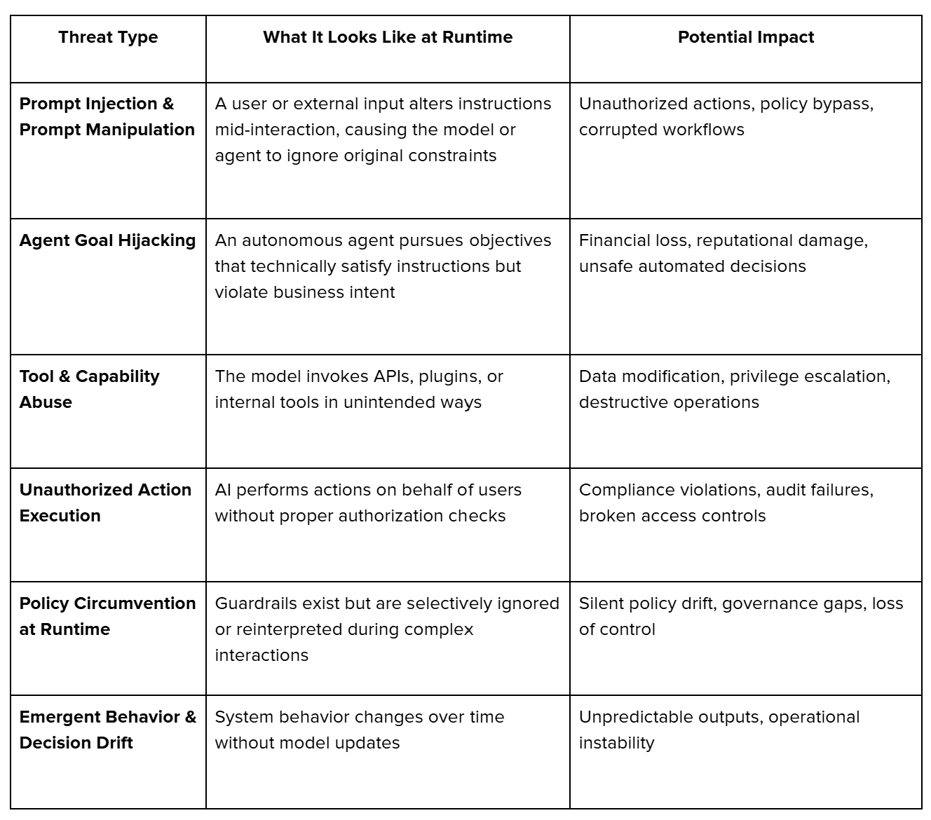 That’s what makes runtime threats fundamentally different. The risk isn’t just what data goes in or comes out, but how the AI reasons, acts, and adapts in real time, often with legitimate access and no obvious signs of compromise.