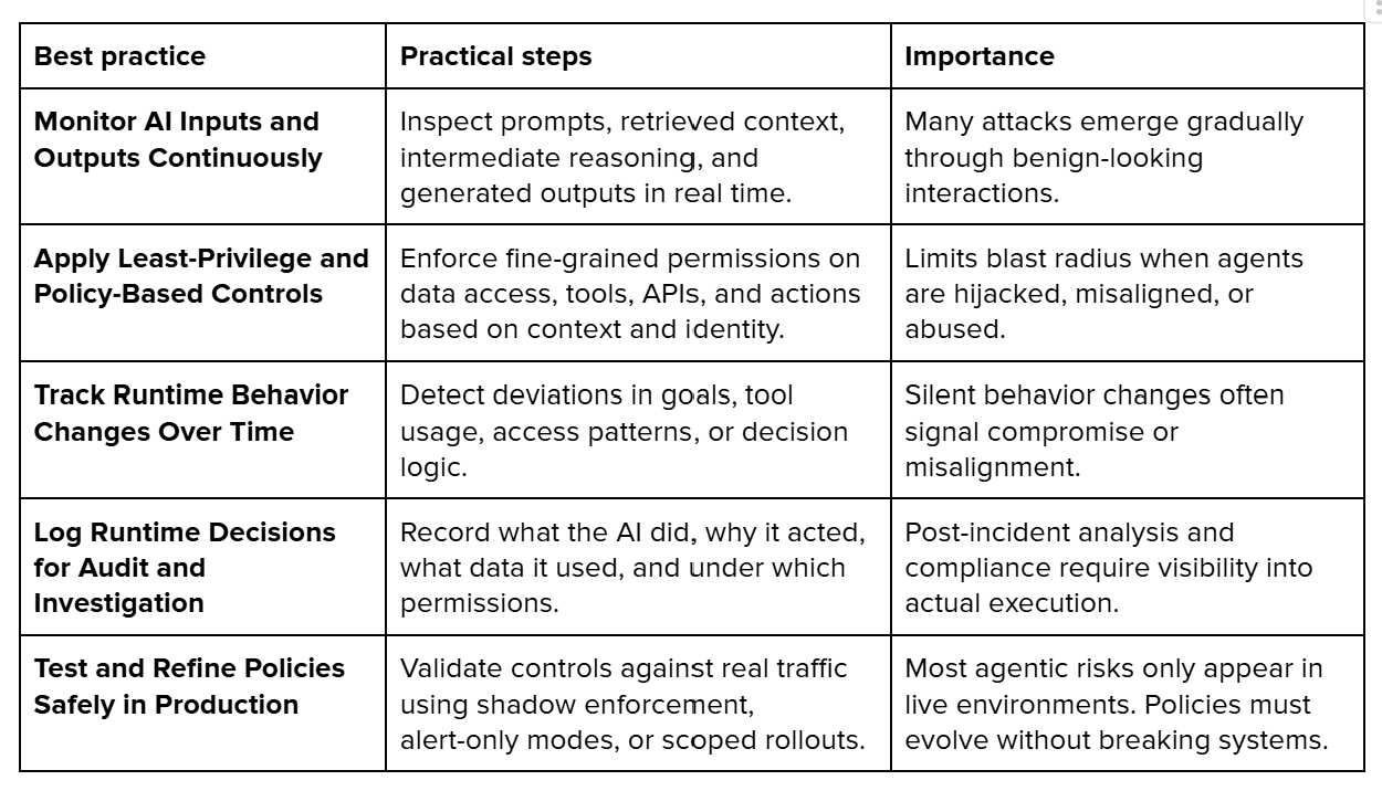 The table below outlines core best practices for securing GenAI applications and agentic workflows in production.