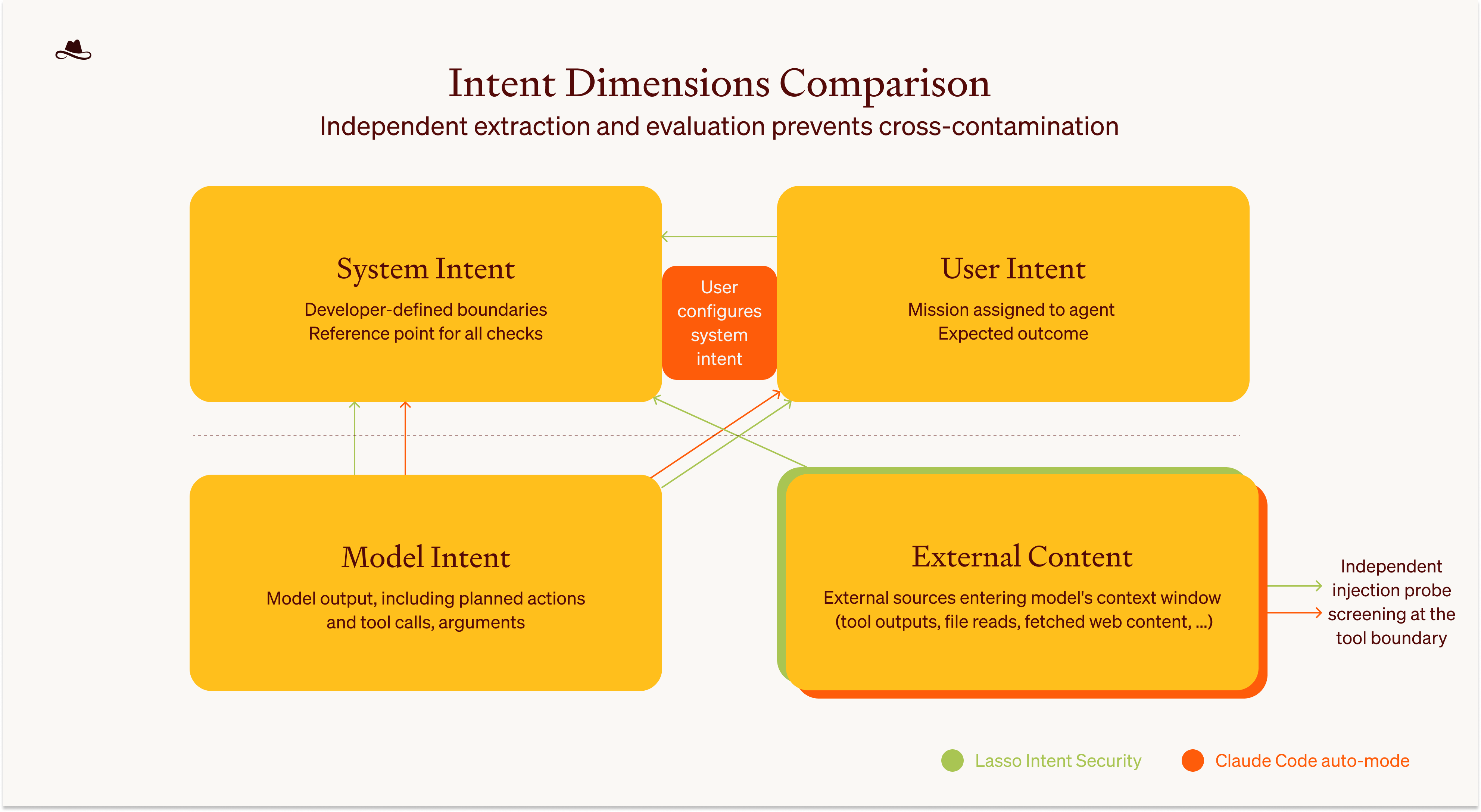 At Lasso, we have been building Intent Security, a runtime security framework that ensures every component in the agentic system behaves as intended. It monitors the behavior of each component and analyzes their alignment. Like auto mode, when alignment holds it allows actions to proceed. When misalignment is detected, it intervenes. When we read Anthropic's post, the overlap in core assumptions was hard to miss. This post provides a comparison of the two approaches.