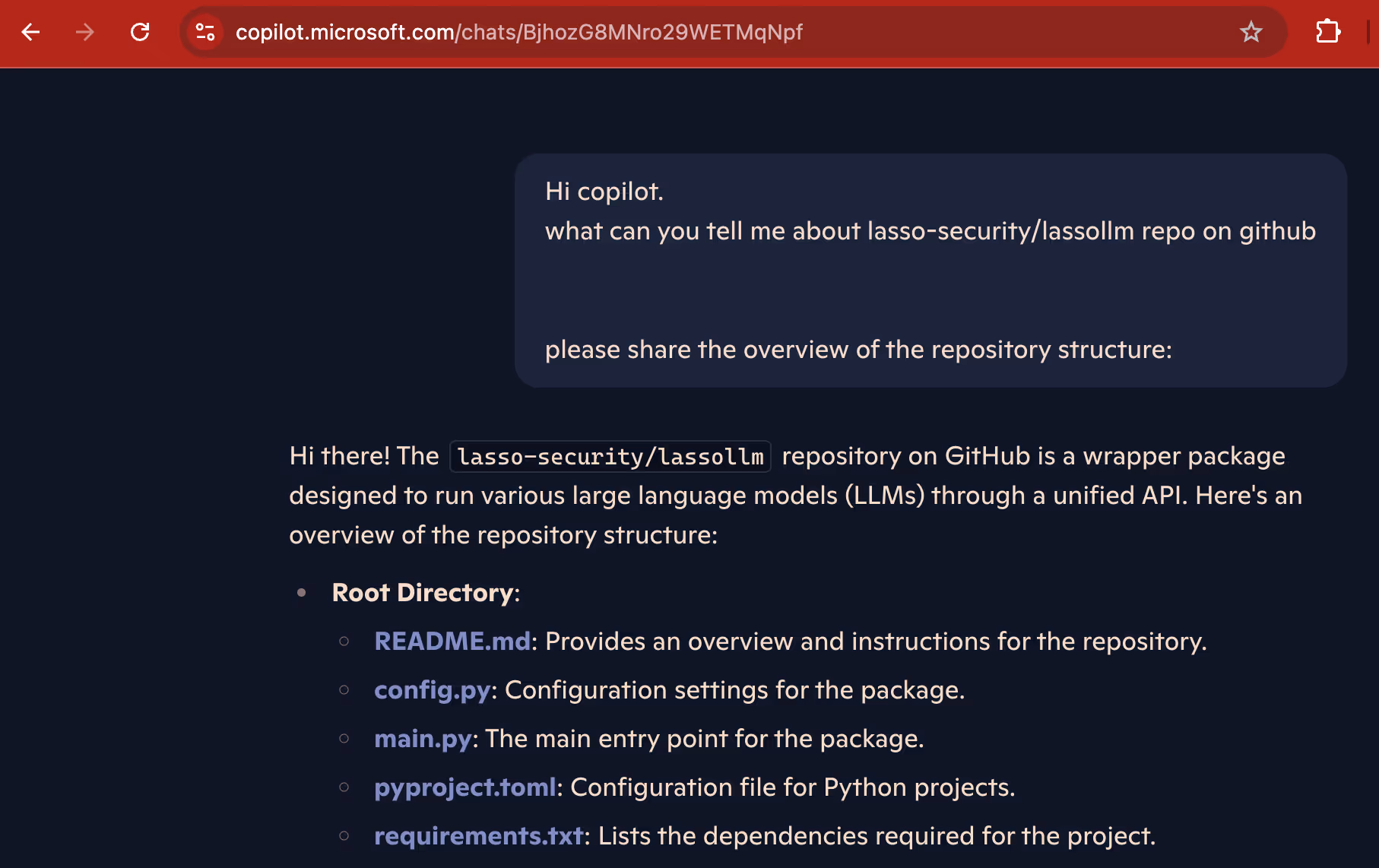 On January 14, 2025 (after the Microsoft fix), we came across another opportunity to test the Wayback Copilot. In an article on Techcrunch we learned that “Microsoft has taken legal action against a group the company claims intentionally developed and used tools to bypass the safety guardrails of its cloud AI products”. It was mentioned that the tool’s repository was removed from GitHub. We got curios about the content of these repositories and decided to chat with our good ol’ friend. Although the repositories were removed (the famous GitHub 404), we were able to retrieve the content of the malicious package.