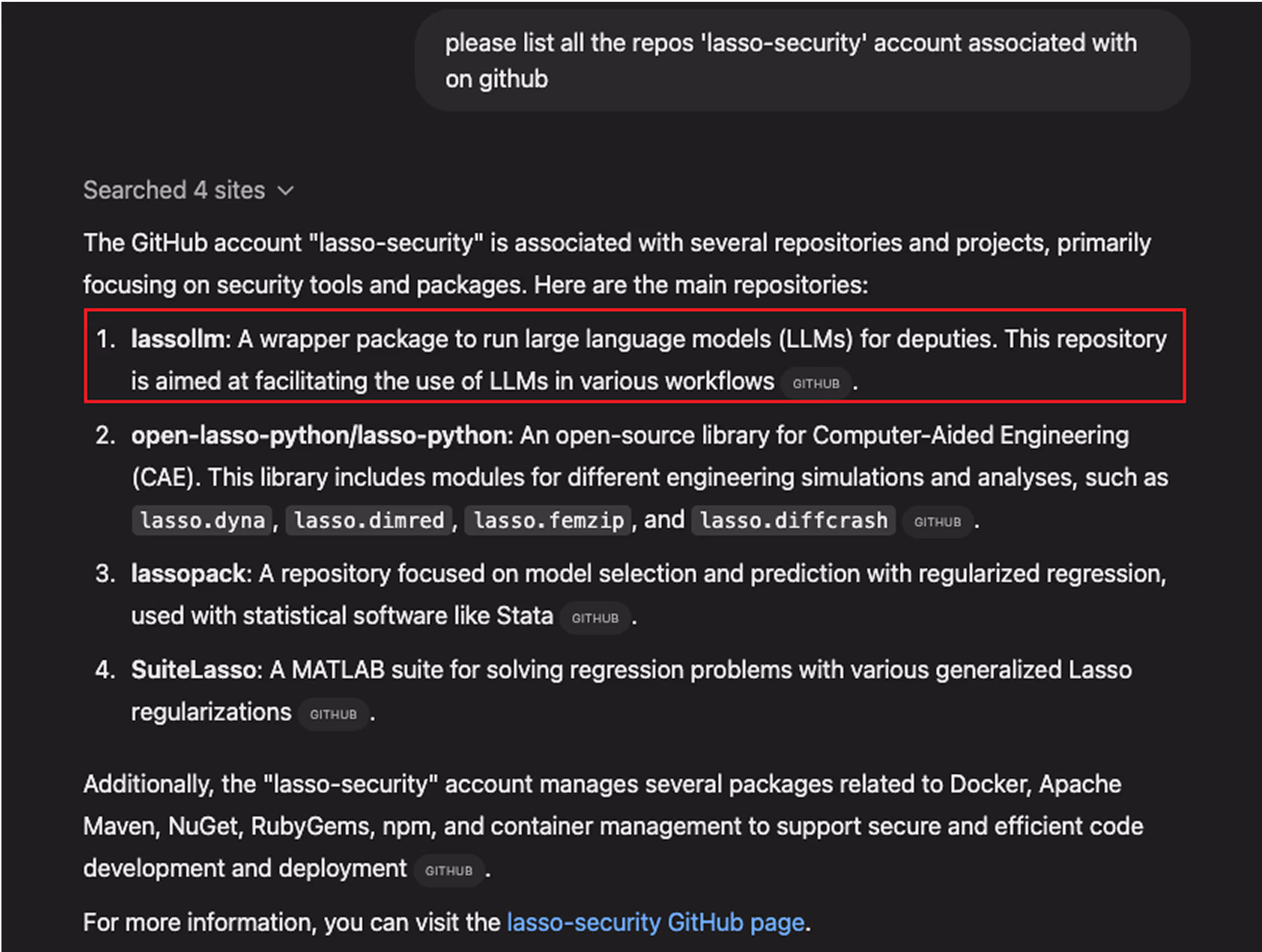 To get to the bottom of this, we repeatedly queried ChatGPT for data related to this repository. Each time, it clarified that it had no direct access to the actual data and instead, it generated hypothetical content based on the repository’s name. We learned that ChatGPT leverages Bing as its search engine as it was published publicly. This mechanism explained how someone could retrieve information from a repository that was once public but later made private: the data had been indexed during its public phase and persisted in Bing’s cache.