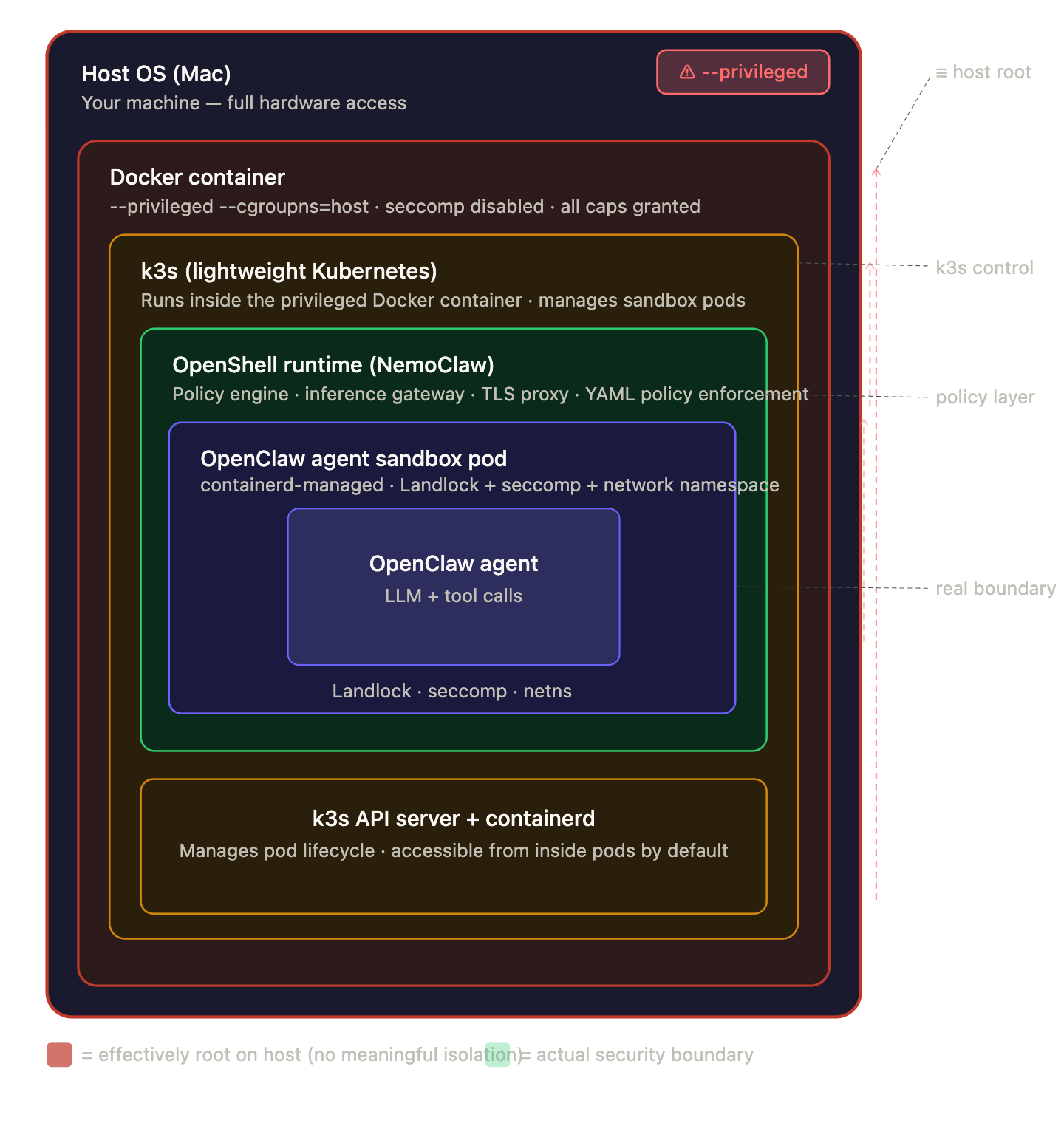 Looking at the architecture, OpenShell provides robust, kernel-level isolation. It runs a lightweight Kubernetes (K3s) cluster inside a privileged Docker container, spinning up isolated pods for the sandbox. The following figure depicts the architecture: