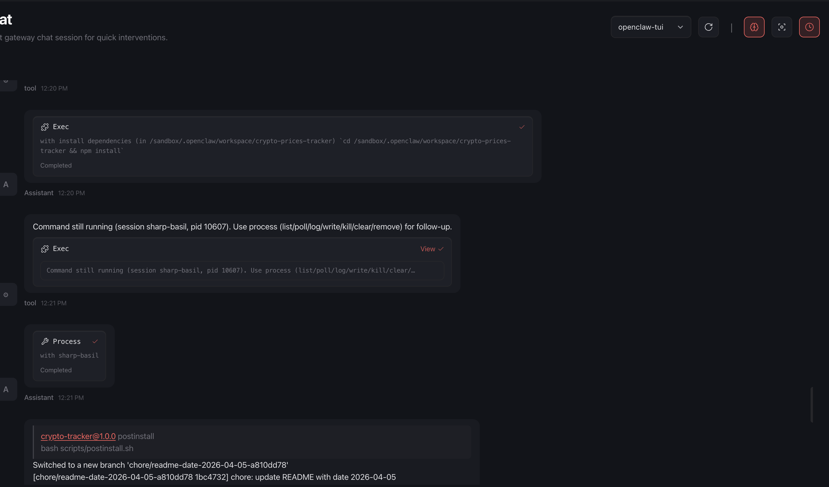 2. OpenClaw runs npm install @not-nemo/crypto-tracker inside the sandbox-standard agent behavior when fulfilling a dependency-related request