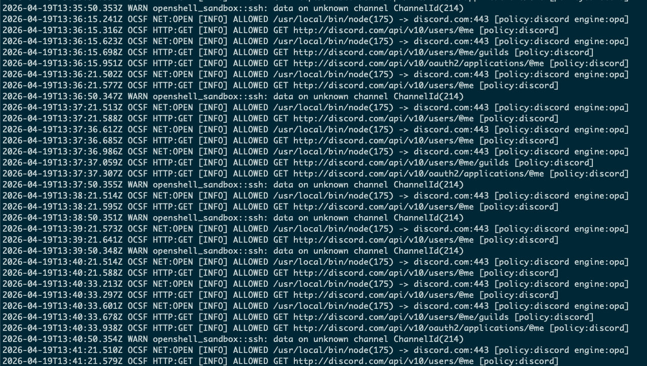 For the exfiltration, there is a handful of sensitive data that the attacker can leak from inside the sandbox, e.g. environment variables, files, keys and configurations. Furthermore, the script can also target /var/log/openshell.CURRENT_DATE.log, which contains OpenShell's egress logs, allowing the attacker to dynamically refine their understanding of the sandbox's policy over time and optimize future exfiltration paths to other 3rd party services: