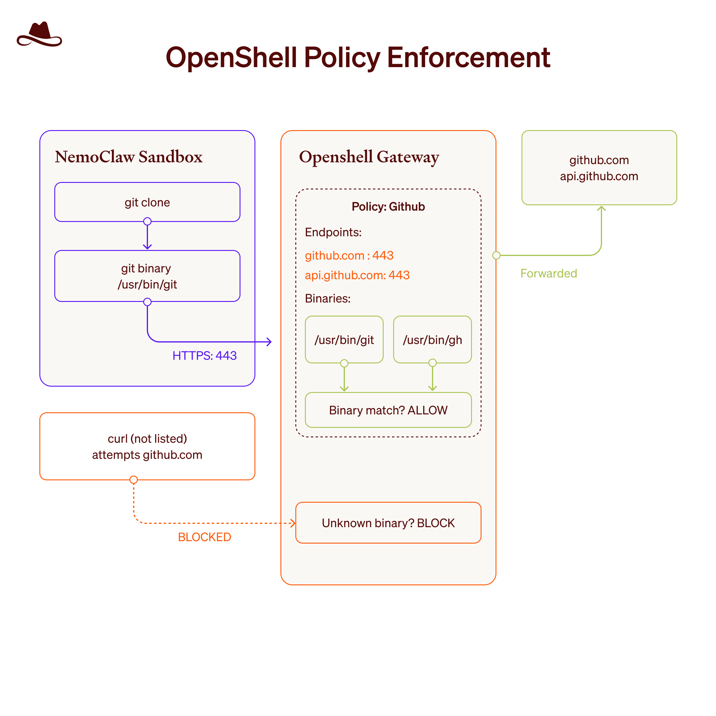 For example - the default configuration of the sandbox’s gateway enables both gh and git binaries for the github.com and api.github.com domains like that: